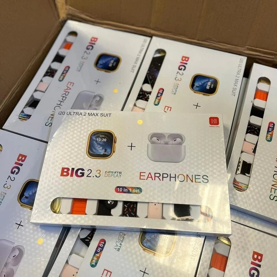 Experience the ultimate convenience and luxury with the i20 ULTRA 2 MAX SUIT. This sleek and stylish box includes 10 smart watches and AirPods Pro-2 buffer for the ultimate wireless experience. With 7 interchangeable straps, Bluetooth calling capability, and a deluxe gift packaging, indulge in the best of both worlds.